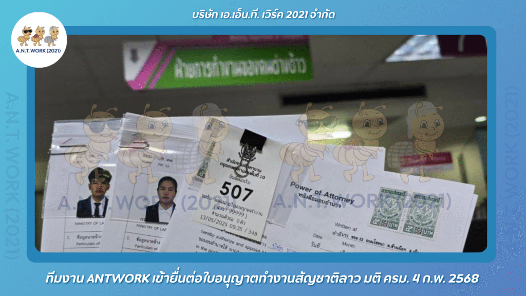 เมื่อวันที่ 14 พฤษภาคม 2568 เจ้าหน้าที่ บริษัท เอ.เอ็น.ที. เวิร์ค 2021 จำกัด ซึ่งเป็นผู้นำในธุรกิจนำเข้าและจัดหาแรงงานต่างด้าว (MOU) ทีมงาน ANTWORK เข้ายื่นต่อใบอนุญาตทำงานสัญชาติลาว มติ ครม. 4 ก.พ. 2568